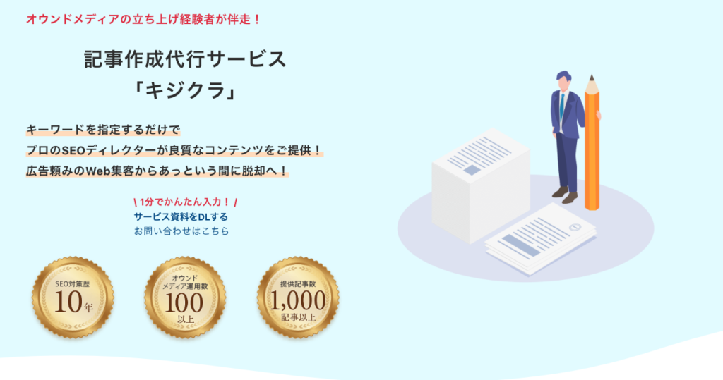 特徴「キジクラ」は、ウェブ集客を強化したい企業のために、プロのSEOディレクターが良質なコンテンツを提供する記事作成代行サービスです。