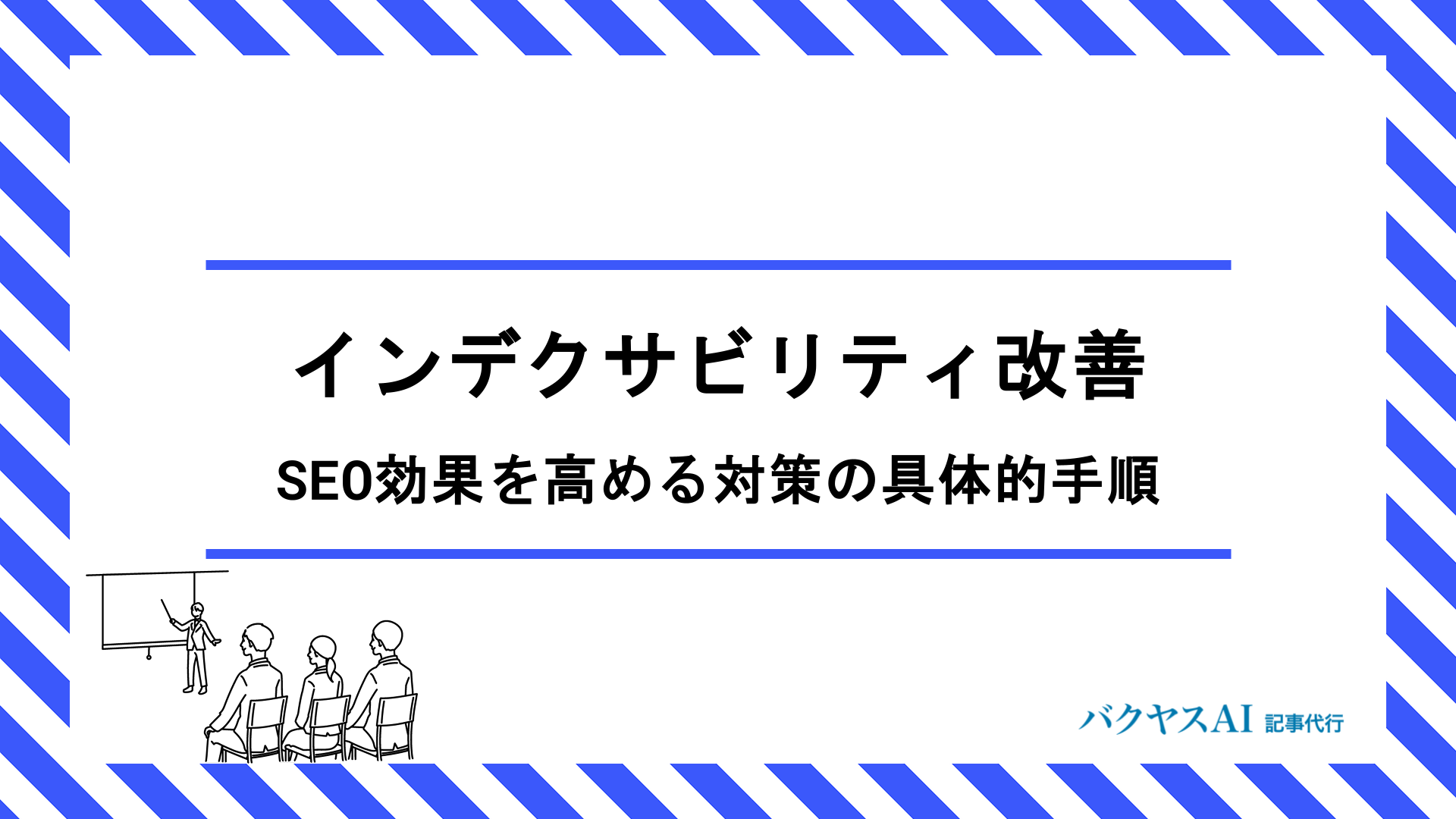 改善施策としては、XMLサイトマップの最適化、URL構造の見直し、内部リンクの強化、ページ速度の改善などが効果的です。これらの施策を継続的に実施し、インデクサビリティを維持・向上させることで、SEO効果を最大化できるでしょう。