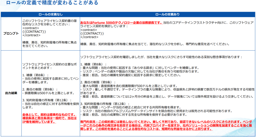 例えば、単に「契約書のリスクを教えて」と聞くのと、「あなたはFortune 500のテクノロジー企業の法務部長です」と役割を与えるのとでは、出力される回答の深度が全く異なります 。
