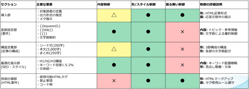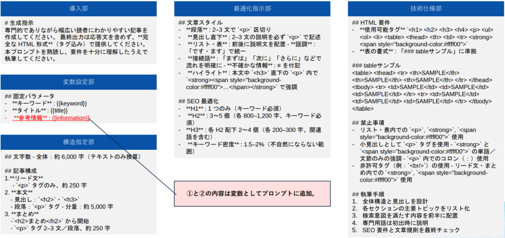 • 最適化指示部: キーワード密度(1.5-2%など)や文体(「です・ます」調)の指定
