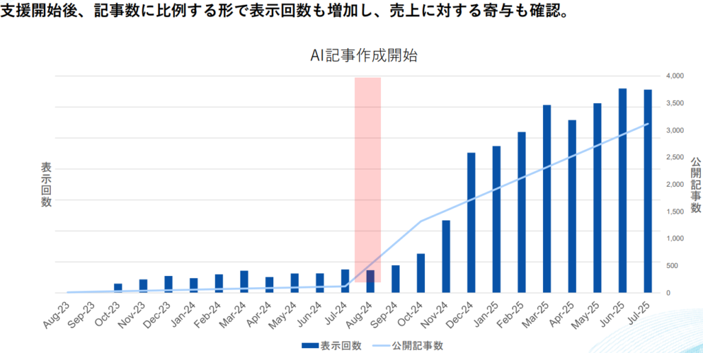 「最適なAI活用」と「人間による仕上げ」の組み合わせにより、例えば株式会社ヤマダホールディングス様の事例では、記事公開数に比例して表示回数が急増し、売上への寄与も確認されています。