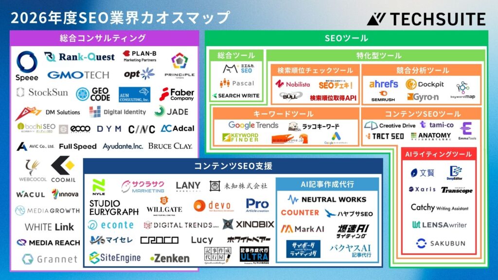 こうした背景を踏まえ、弊社は2026年度版の「SEO業界カオスマップ」を公開いたしました。本マップは、企業のマーケターや担当者の皆様が、最新の業界構造を迅速に把握し、自社のSEOの課題に最適なパートナーやツールを選定するための指針となることを目的としています。