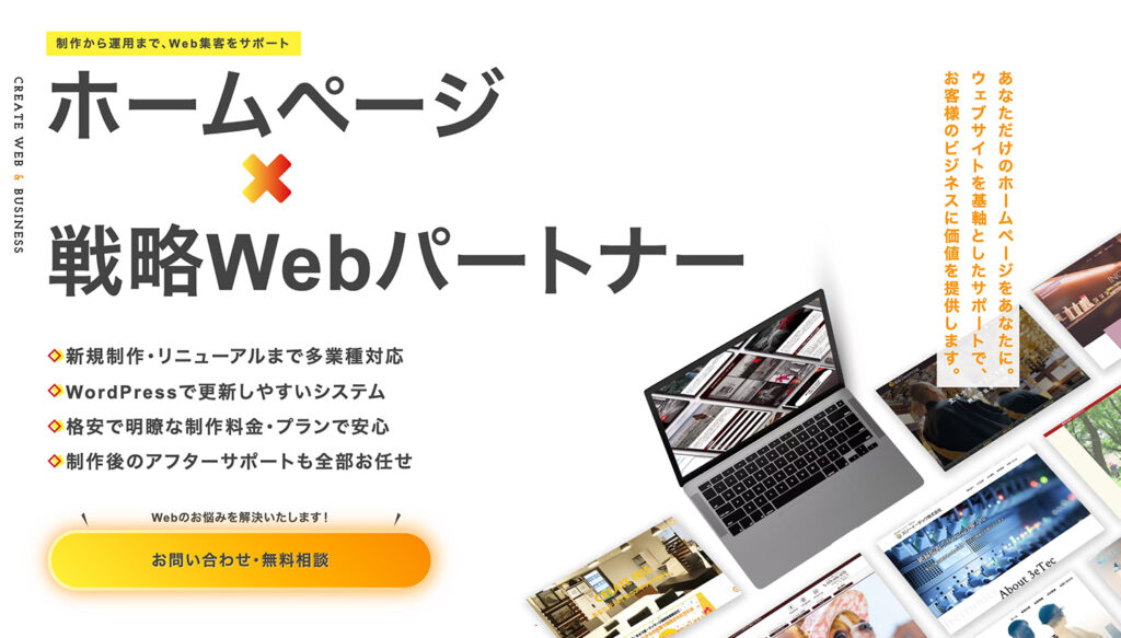 | 費用 | ホームページスタートプラン:20万円~ CMSホームページ制作プラン:50万円~ 集客・求人特化ホームページ制作プラン:100万円~ ECサイトスタートプラン:50万円~ 求職者登録・応募システム開発:200万円~ |
