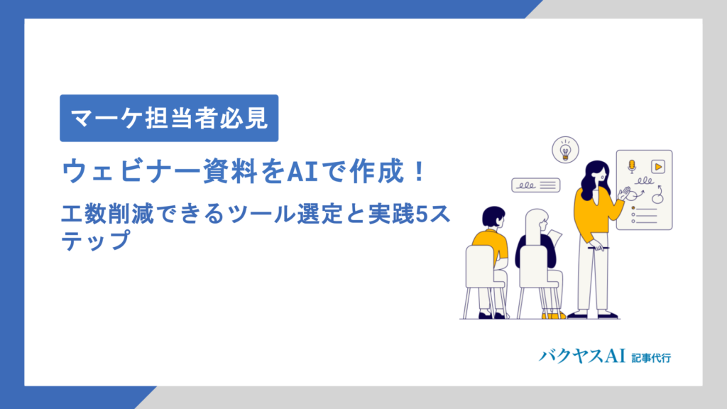 AI×ウェビナー資料作成で準備工数を大幅削減```html ウェビナーの準備において、資料作成は最も時間のかかる工程の一つです。内容の企画から構成の検討、スライドのデザイン、配布資料の準備まで、多くの工数が必... -