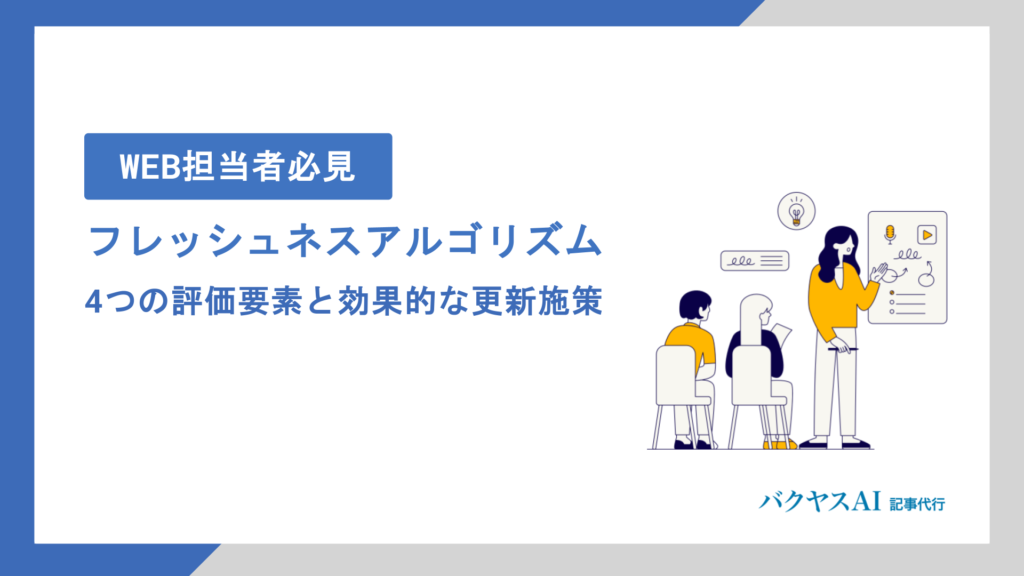 フレッシュネスアルゴリズム対策|4つの評価要素と効果的な更新施策を解説この記事でわかること フレッシュネスアルゴリズムの基本的な仕組みと役割 Googleが2011年に導入したフレッシュネスアルゴリズムは、検索クエリに応じて新しいコンテン... -