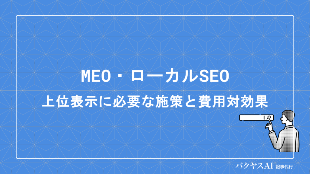 MEO・ローカルSEO対策の基本|上位表示に必要な施策と費用対効果を解説地域密着型のビジネスを展開するうえで、インターネット検索からの集客は欠かせない要素となっています。特に「近くのカフェ」「渋谷 美容院」といった地域名を含む検索... -