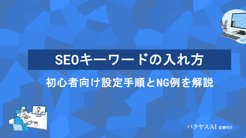 SEOキーワードの入れ方|初心者向け設定手順とNG例を解説この記事でわかること SEOキーワードを入れるべき場所 タイトルタグ、メタディスクリプション、見出しタグ、本文、URL、画像のalt属性など、7つの重要な設置場所があり... -
